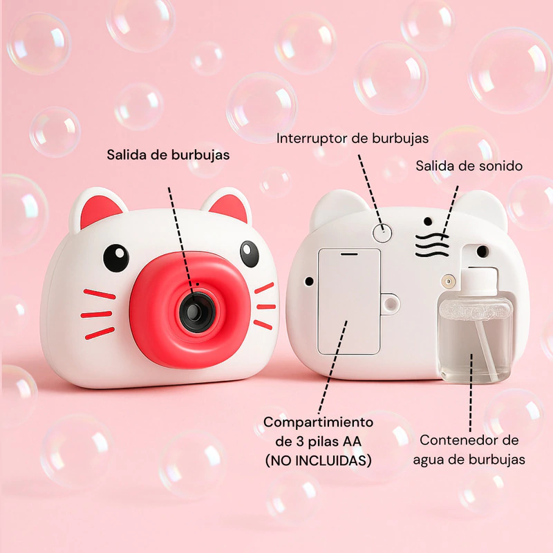 Su diseño creativo imita una cámara real, lo que lo hace perfecto para juegos imaginativos y sesiones de fotos divertidas, mientras que su mecanismo automático genera una lluvia constante de burbujas con solo presionar un botón, sin necesidad de soplar. Equipado con melodías alegres y luces brillantes, transforma cualquier espacio en una fiesta llena de color y movimiento, ideal para cumpleaños, reuniones familiares o tardes de juego al aire libre y en interiores.
