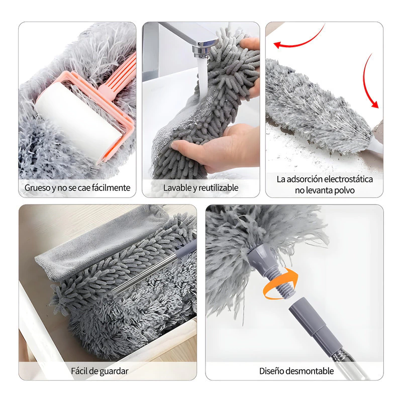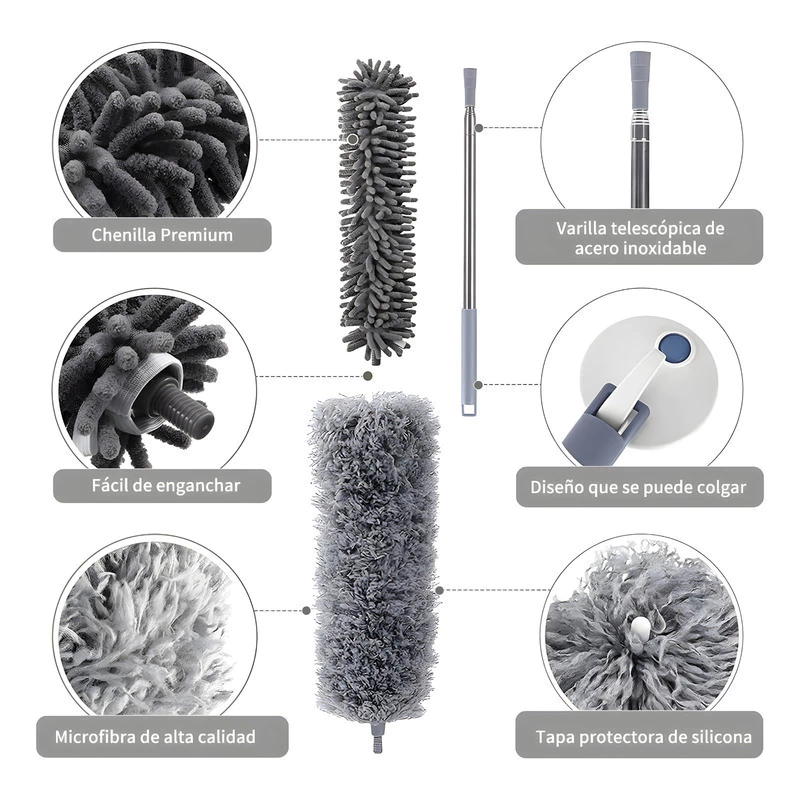¿Cansado de plumeros que no llegan a esos lugares difíciles? Con el Plumero 4 en 1 de CG, limpiar es más fácil y efectivo que nunca. Este set incluye 1 varilla extensible de acero inoxidable y 3 cabezales de microfibra para que tengas la herramienta perfecta para cada tarea de limpieza.